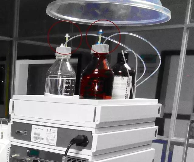 液相溶劑瓶原裝蓋上有兩個(gè)小孔,如果擔(dān)心空氣當(dāng)中的懸浮顆粒會(huì)落入瓶中,污染流動(dòng)相,為了避免污染,又防止出現(xiàn)內(nèi)外壓差,對(duì)溶劑瓶做了如下小改進(jìn):