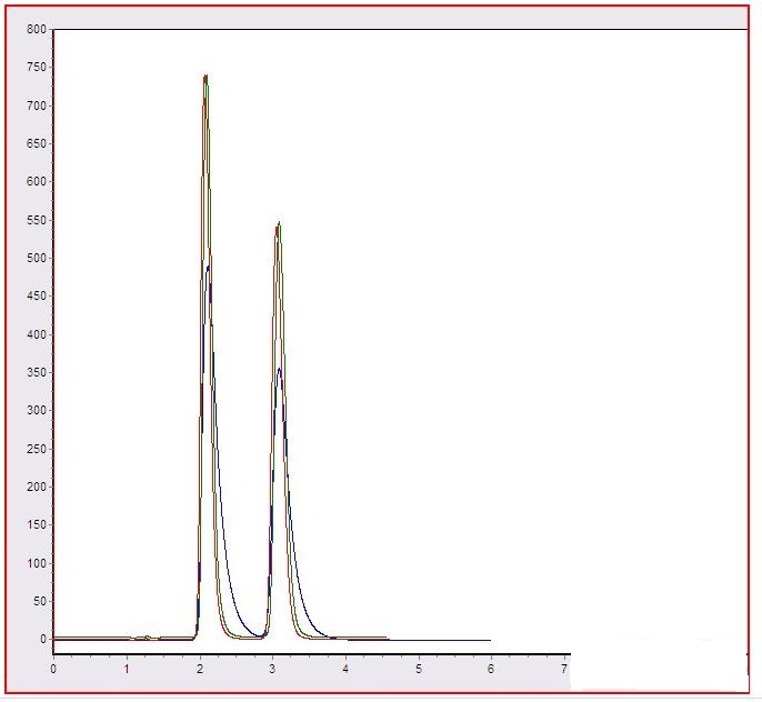 先看一下污染后的色譜圖(黑色)再生后的色譜圖(綠色) 修補(bǔ)后的色譜圖(紅色):