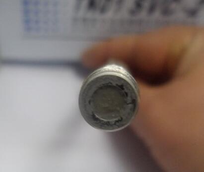 這時(shí),色譜圖還是有點(diǎn)拖尾,卸開(kāi)色譜柱進(jìn)口螺帽,看污染情況,如下圖:(柱頭填料污染)