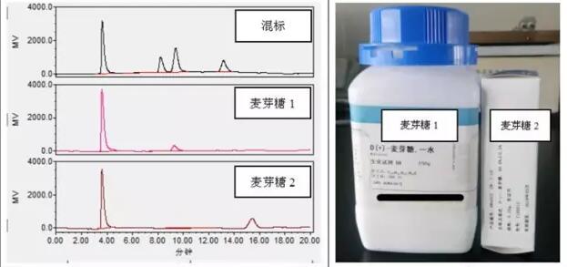 難道是色譜柱的原因?色譜柱柱效下降導致兩者不能分離?于是更換新的色譜柱再次分離,結果還是沒有能夠將兩者分離。如果葡萄糖和麥芽糖無法分離,實驗便無法進行下去,在經(jīng)過上述嘗試之后將問題的矛頭指向了所用的試劑。查試劑臺賬,發(fā)現(xiàn)實驗室里還有其他品牌分析純的葡萄糖,而麥芽糖僅此一瓶,但是幸運的是發(fā)現(xiàn)了葡萄糖和麥芽糖的標準品,決定使用麥芽糖和葡萄糖的標準品試一下。