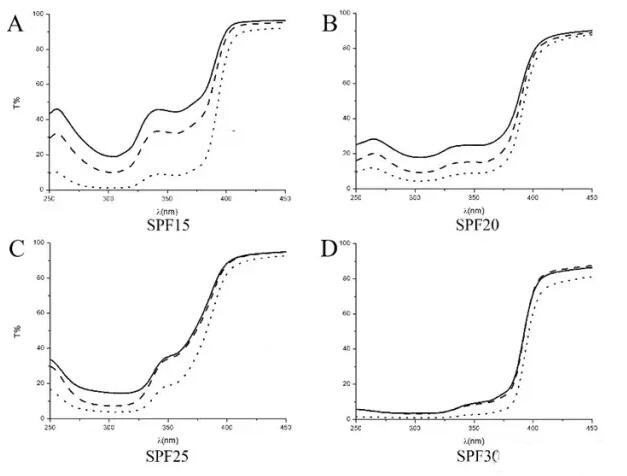 說明SPF值越大的化妝品對紫外光譜的遮蔽效應(yīng)越明顯,這與化妝品的真實(shí)效應(yīng)相符,同時也驗(yàn)證了使用本法進(jìn)行防曬化妝品的檢驗(yàn)和評價是可行和可靠的。