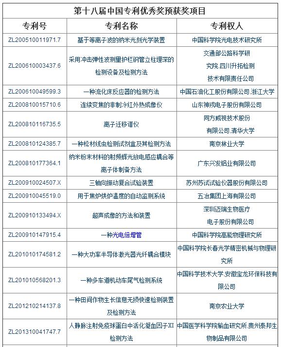 據(jù)悉,根據(jù)《中國(guó)專(zhuān)利獎(jiǎng)評(píng)獎(jiǎng)辦法》,第十八屆中國(guó)專(zhuān)利獎(jiǎng)共評(píng)選出中國(guó)專(zhuān)利金獎(jiǎng)?lì)A(yù)獲獎(jiǎng)項(xiàng)目20項(xiàng),中國(guó)外觀設(shè)計(jì)金獎(jiǎng)?lì)A(yù)獲獎(jiǎng)項(xiàng)目5項(xiàng),中國(guó)專(zhuān)利優(yōu)秀獎(jiǎng)?lì)A(yù)獲獎(jiǎng)項(xiàng)目571項(xiàng),中國(guó)外觀設(shè)計(jì)優(yōu)秀獎(jiǎng)?lì)A(yù)獲獎(jiǎng)項(xiàng)目65項(xiàng),公示期為2016年10月19日至25日�! �