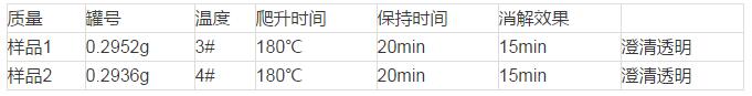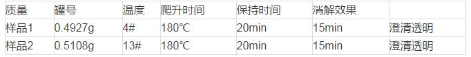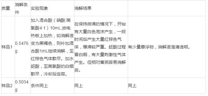 1.濕法消解,加入混合酸10mL進(jìn)行消解,消解過程相當(dāng)耗時,并且難于控制。消解過程中消解液很容易變?yōu)楹诤稚�,需要補(bǔ)加混合酸,得到的消解液有少量懸浮物,呈微黃色或微紅色。