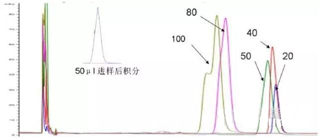 圖4 依次進(jìn)樣20,40,50,80,100μl的色譜圖。小圖為50μl進(jìn)樣后積分,該圖顯示色譜峰有肩峰