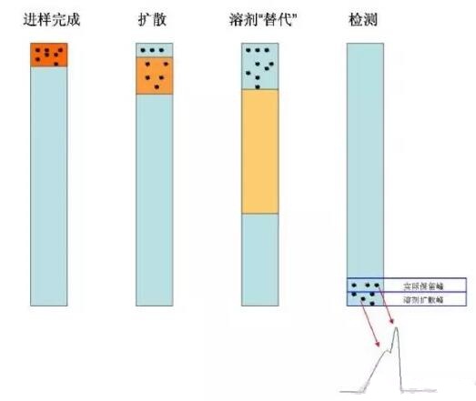 造成這些現(xiàn)象的原因只有一個:溶解分析物F的溶劑,增加進(jìn)樣體積只是放大了溶劑影響。在我們的實驗中,溶劑采用80%的甲醇溶解,而流動相是15%的乙腈,在反相色譜中,80%的甲醇洗脫能力強(qiáng)于15%的乙腈,就是說溶解F的溶劑極性小于流動相的極性。當(dāng)樣品進(jìn)入色譜后,一部分分析物質(zhì)會和固定相結(jié)合,一部分還沒有和固定相結(jié)合就被洗脫能力強(qiáng)的溶劑帶著沿流動方向移動(色譜柱縱軸),這樣分析物就發(fā)生了擴(kuò)散(圖5擴(kuò)散),當(dāng)進(jìn)樣體積加大,進(jìn)入色譜系統(tǒng)的溶劑會改變色譜柱的流動相組成,甚至?xí)斕娴袅鲃酉啵▓D5溶劑替代),在溶劑的洗脫下,出峰時間就會提早,溶劑里的分析物F和在色譜過程開始的與固定相結(jié)合的分析物F會先后流出,這樣就形成了分叉峰(圖5檢測)。