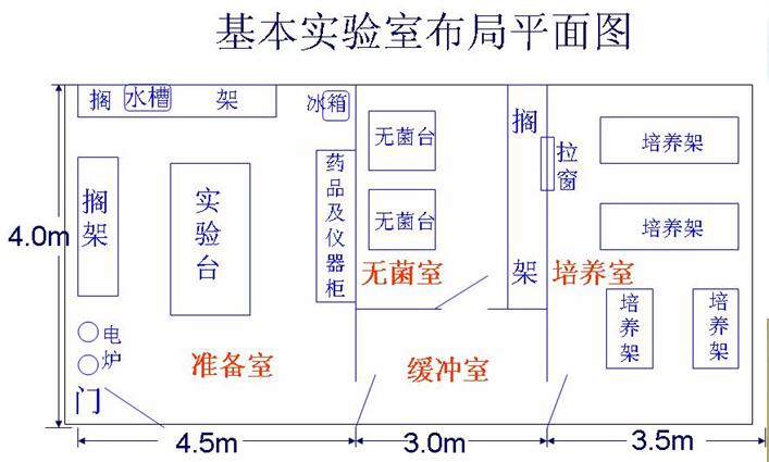 標準組織培養(yǎng)室包括藥品區(qū)、洗滌區(qū)、制備區(qū)、滅菌區(qū)、儲放區(qū)、無菌操作區(qū)和培養(yǎng)區(qū)等,可以根據(jù)自己的實際條件進行合并組建。