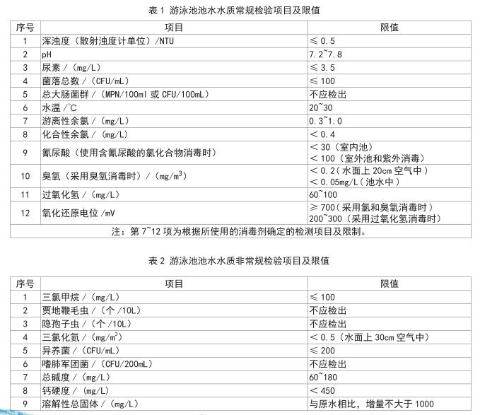 內(nèi)容:規(guī)定了室內(nèi)外公共游泳場(chǎng)所的建設(shè)衛(wèi)生要求、設(shè)施設(shè)備要求、日常運(yùn)行管理要求及水質(zhì)衛(wèi)生和游泳館空氣等標(biāo)準(zhǔn)值及檢測(cè)方法。游泳場(chǎng)所應(yīng)配備檢測(cè)余氯、渾濁度、pH值、池水溫度等直讀的檢測(cè)設(shè)備,并保持計(jì)量準(zhǔn)確。每場(chǎng)開放前、室內(nèi)游泳場(chǎng)所每?jī)尚r(shí)、室外游泳場(chǎng)所每小時(shí)均應(yīng)進(jìn)行池水游離性余氯、渾濁度、pH值、池水溫度等指標(biāo)自檢。