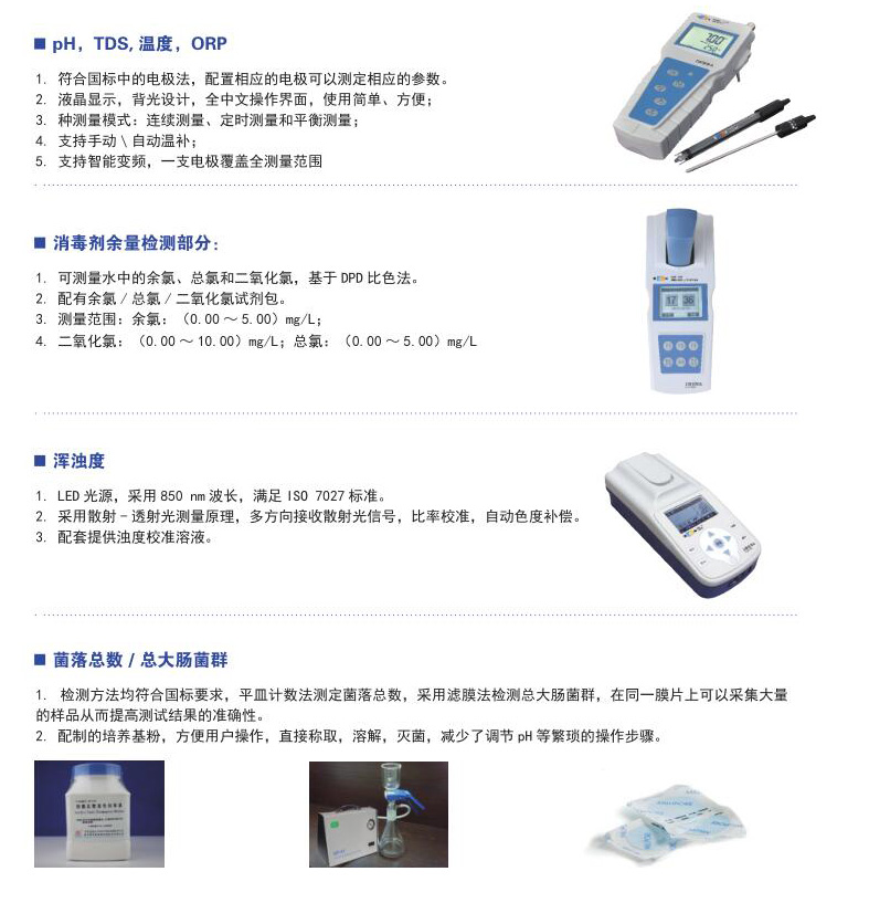 圍繞游泳池水質(zhì)檢測(cè)應(yīng)用進(jìn)行設(shè)計(jì),可滿足包括pH、渾濁度、尿素、菌落總數(shù)、氰脲酸等在內(nèi)的11項(xiàng)檢測(cè)需求。用戶可根據(jù)自己的需要配置合適的型號(hào)組合,確保水質(zhì)檢測(cè)工作順利開展。