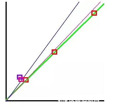 藍色線是標樣濃度比較低的情況下得到的;粉色線是標樣濃度比較高的情況下得到的。可以明顯看到,粉色線更接近綠色的理想標線。這是因為濃度高,這個固定的隨機誤差相對就非常小,極端情況對標線的影響就很小了。