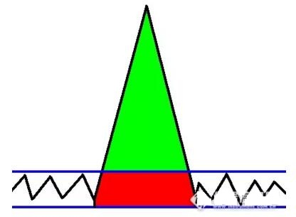 從這個圖中,兩條蘭線之間的黑色折線是色譜基線。我們知道,色譜的基線總是有一定寬度的,當色譜峰出來后,在正確的積分條件下,藍線上面的綠色面積一定會得到準確積分。但基線寬度內的紅色部分,就不確定了。