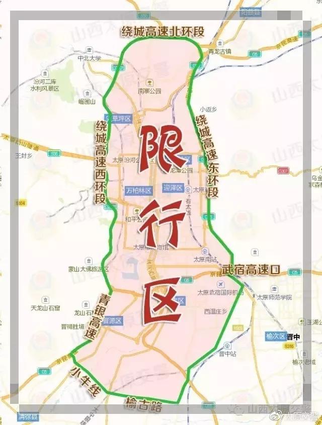 二、限行區(qū)域:繞城高速東環(huán)段、太榆路(武宿高速口至晉中段)以西,繞城高速北環(huán)段以南,繞城高速西環(huán)段、青銀高速(太原羅城至清徐段)以東,小牛線、榆古路以北(不含上述道路)道路范圍內。